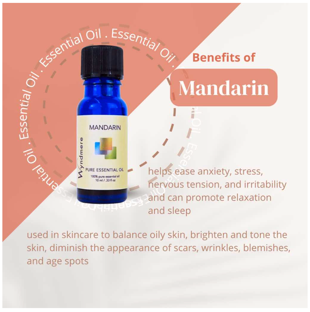 Mandarin has a sweet, floral citrus scent. It helps ease anxiety, stress, nervous tension, and irritability and can promote relaxation and sleep. Mandarin helps support a healthy digestive system helping to relieve symptoms of indigestion. It's also been used in skincare to balance oily skin, brighten and tone the skin, diminish the appearance of scars, wrinkles, blemishes, and age spots. Mandarin is deodorizing and is often used as an air freshener to combat odors and purify the air.