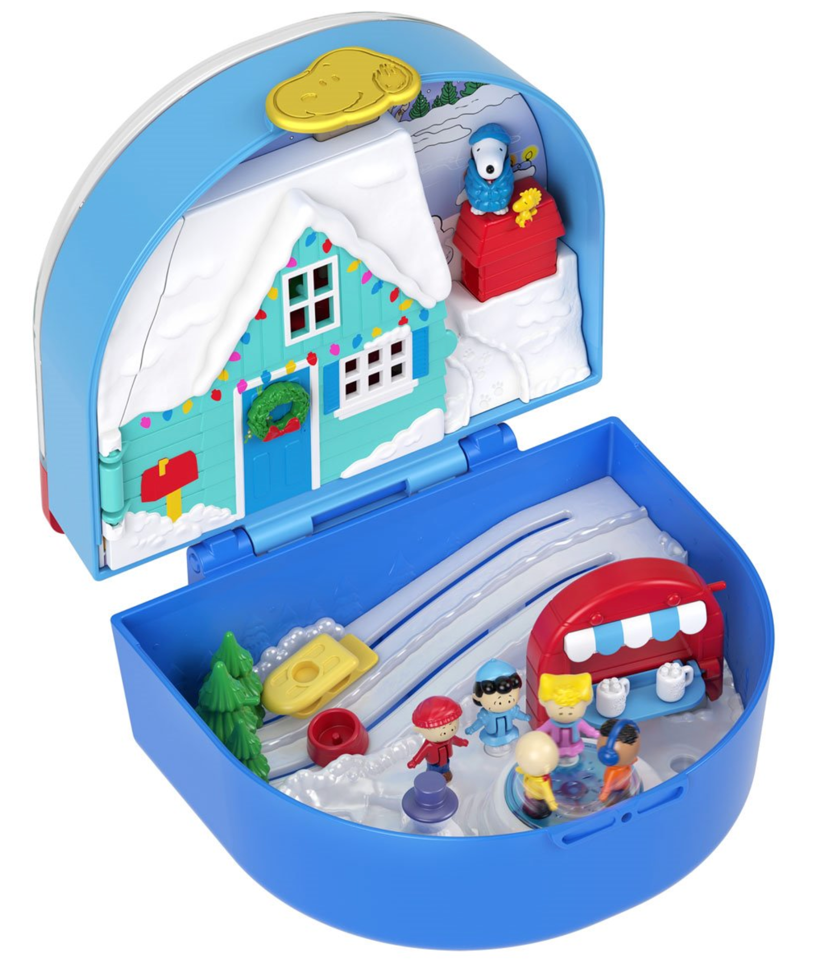 Good grief! Polly Pocket and the Peanuts gang come together in this collector compact for a holiday-themed adventure. Inside, discover a winter wonderland with so many familiar faces! The gang's all here with six micro main character dolls, seven themed accessories including a Woodstock figure, and four iconic locations from the animated series. Reenact scenes and shenanigans with favorite characters like Charlie and Sally Brown, Lucy, Linus, Franklin, Woodstock, and Snoopy – all in micro form! Surprise and delight with Easter Egg features like a dog bowl sled race and a tiny Woodstock figure that can clip throughout the compact. This collectible keepsake is ideal for Polly Pocket and Peanuts fans alike. Includes collector Peanuts x Polly Pocket compact, 6 micro dolls, and 7 accessories including Woodstock figure. Ages 4 and up!