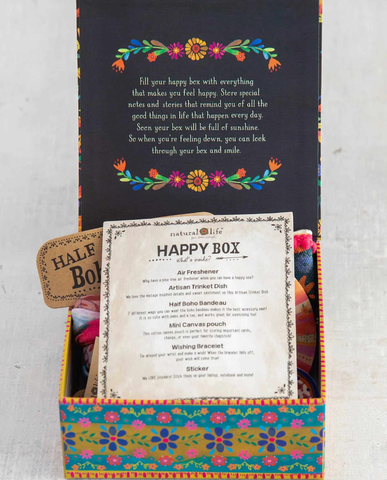 • 6 Irresistible Treasures! Includes: Air Freshener, Artisan Trinket Dish, Half Boho Bandeau®, Mini Canvas Pouch, Sticker & Wishing Bracelet
