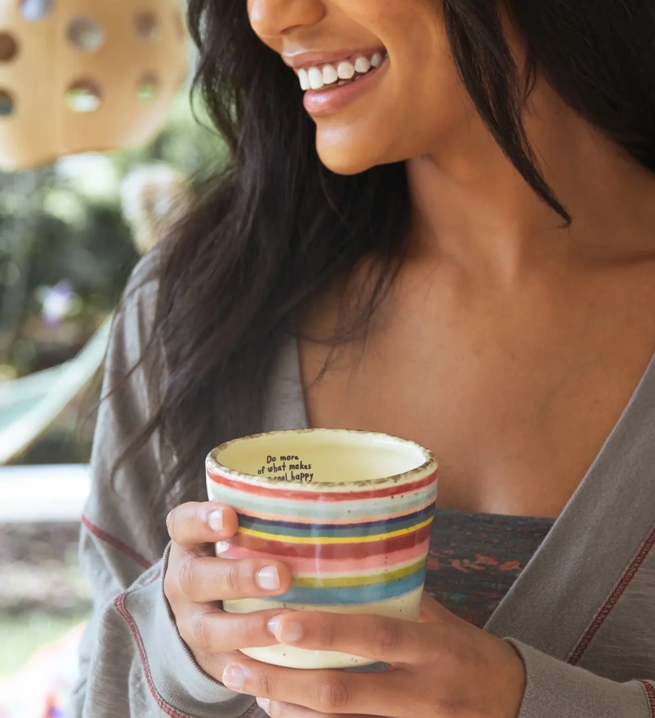 Hand sculpted, features sentiment on the inside rim, "Be Happy" from Natural Life. Ceramic, 16 oz, dishwasher and microwave safe. Measures 5in H x 3.25in diameter