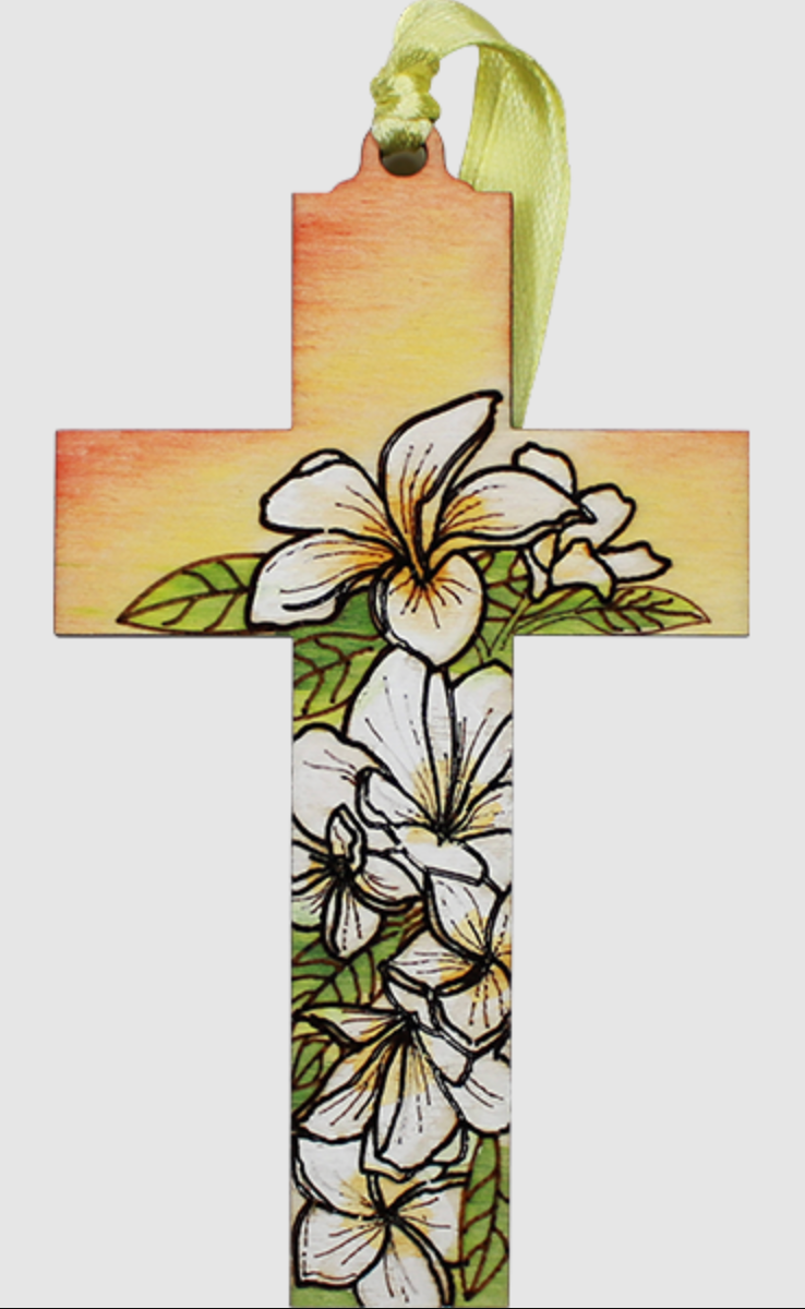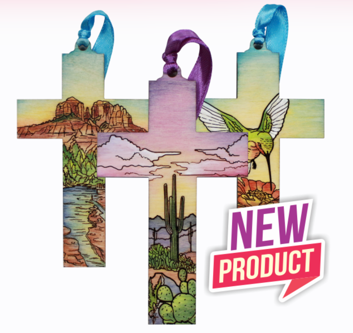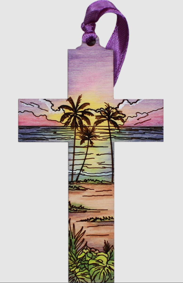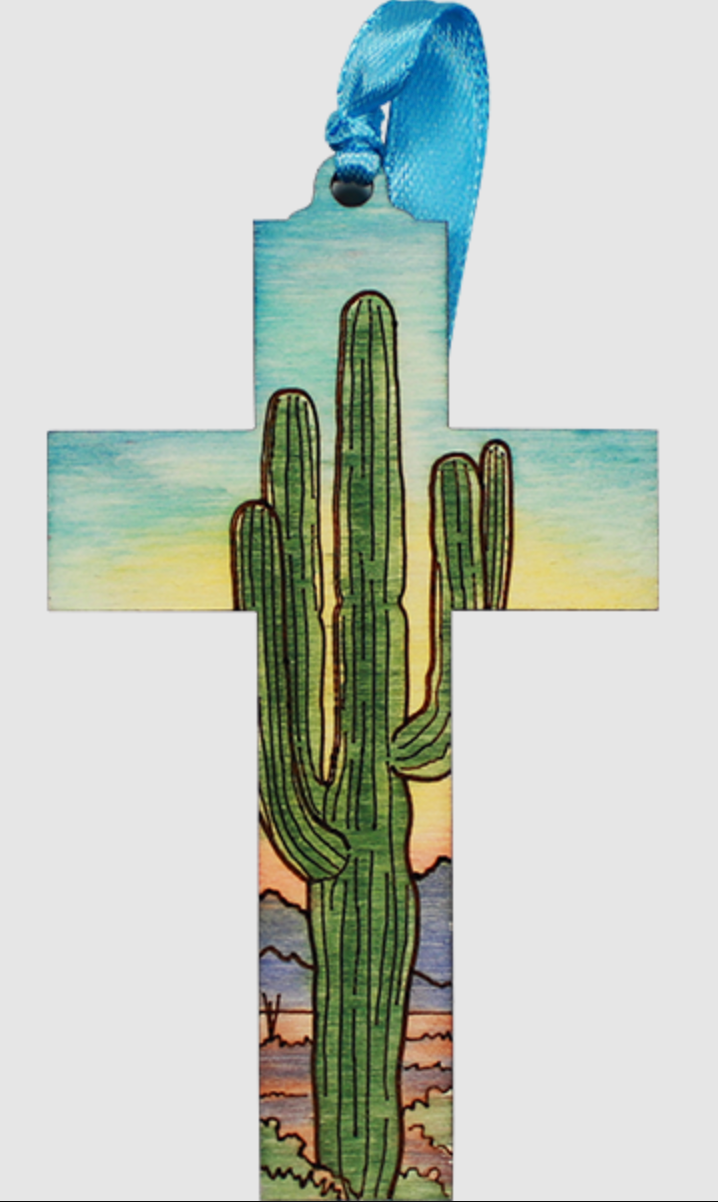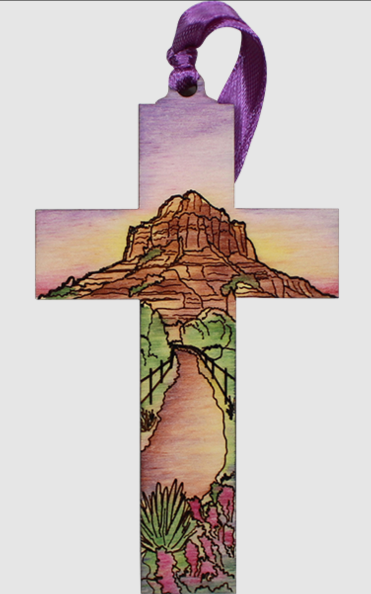 Hand painted, laser engraved, wood cross ornament with ribbon for hanging.